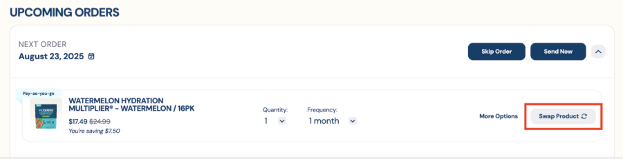 - Once you have logged into your account, you can change flavors by clicking “Swap Product” to the right of the flavor you wish to swap