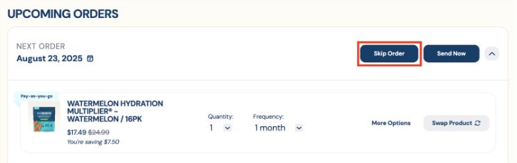 - Once you have logged in to your account, you can skip an order by clicking the “Skip Order” button on the right side of your next upcoming order