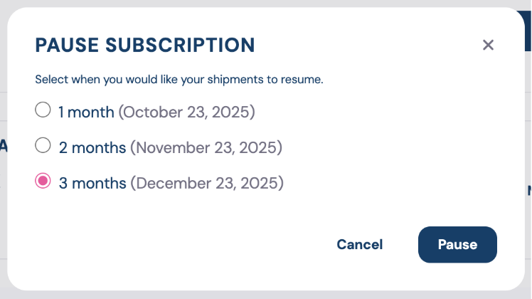 - Please note, if you need to pause your subscription for more than 3 months, we recommend cancelling your subscription and rejoining when you are ready to resume shipments